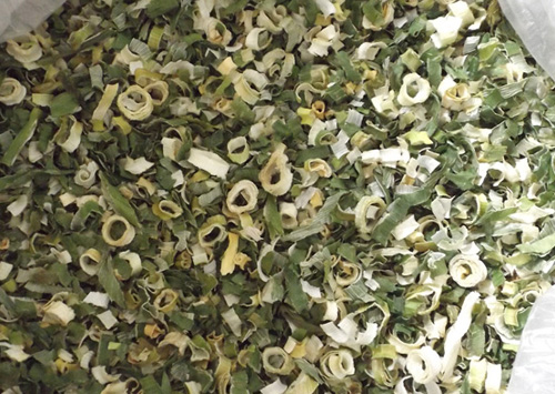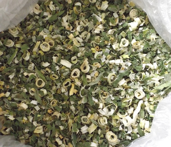 烘干:將甩干的蔥段攤放在烘篩中,裝在烘車層架上,送入干燥機烘干。干燥機在未進料前先行預熱升溫達60℃左右。烘干溫度控制在58~60℃,烘干時間6~7小時。產(chǎn)品含水量降到5%以下。